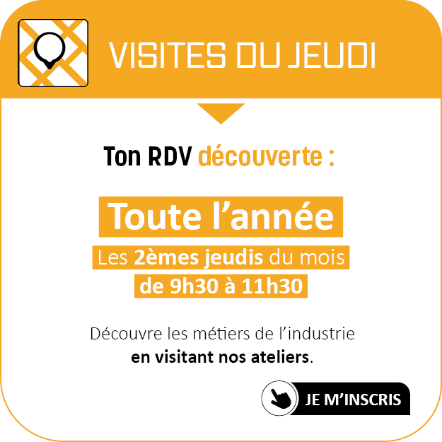 Découvre les métiers de l'industrie, ses savoir-faire et ses opportunités tous les 2èmes jeudis du mois en visitant nos ateliers de 9h30 à 11h30.